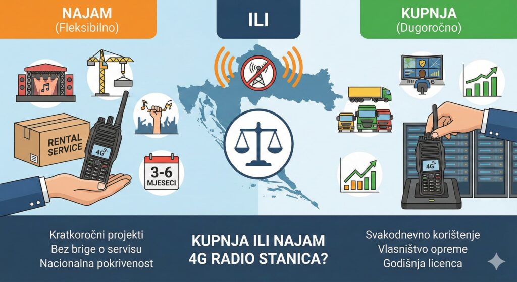 Odlučili ste da vam je potrebna profesionalna komunikacija s nacionalnom pokrivenošću (PoC tehnologija), bez ograničenja dometa. Odličan izbor. No, sada ste pred glavnom dilemom: Trebate li te uređaje kupiti ili unajmiti?